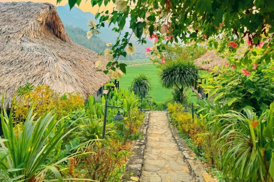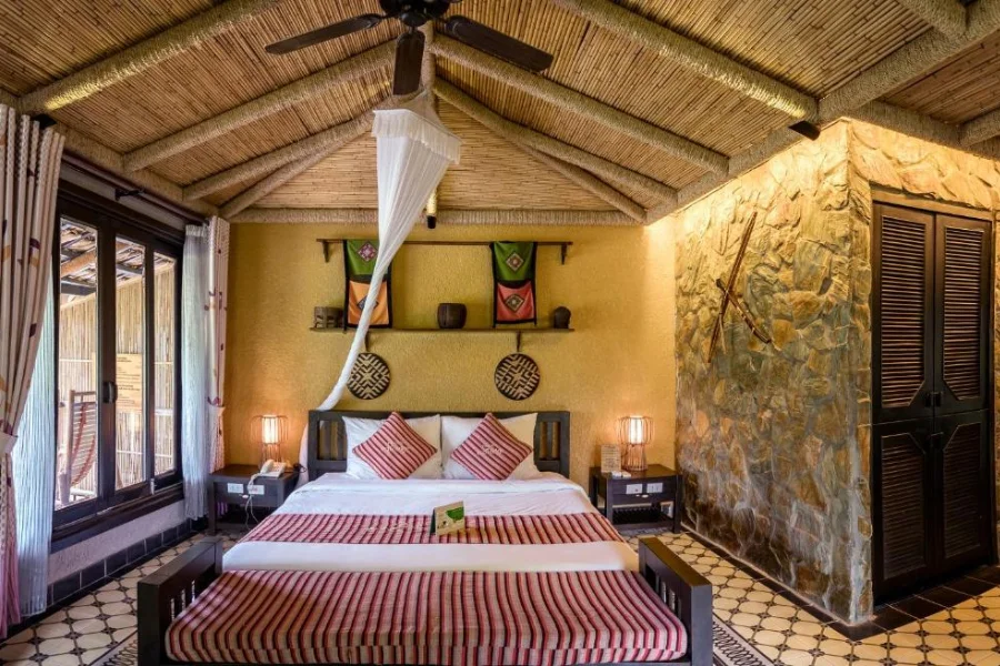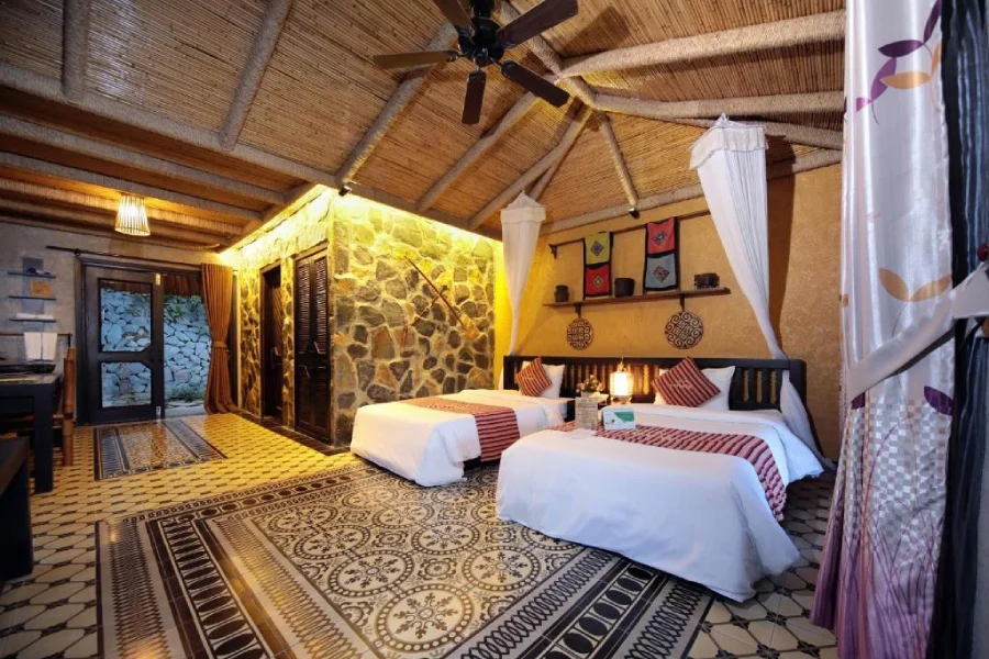 Mai Chau Ecolodge is nestled amid lush mountains and expansive rice fields, offering modern rooms and suites with scenic views and complimentary Wi-Fi. Guests can unwind with a range of on-site amenities, including a restaurant, bar, outdoor swimming pool, and an indoor spa designed for ultimate relaxation.